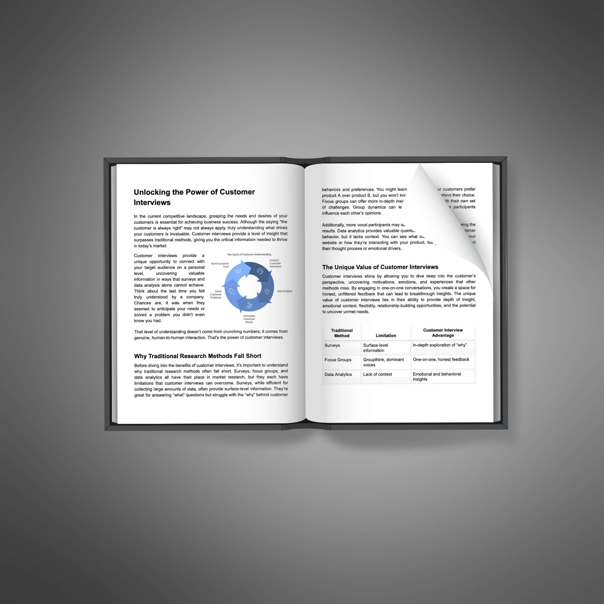 This ebook equips your customers with essential knowledge to understand their audience and run a successful business. It offers clear, step-by-step instructions for conducting effective customer interviews that uncover genuine needs and desires.